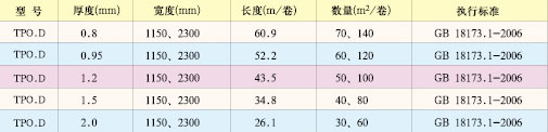 1.产品构成 TPO复合防水卷材是以TPO橡胶为主要原料作为防水芯层,两表面有无纺布做粘接层,采用特殊工艺和传统设备加工而成的的一种复合型防水材料 2.产品特点 三大高性能优点: a. 耐老化性好:TPO橡胶本身性能耐紫外线;臭氧性能好,再加上抗老化剂、抗氧剂、紫外线吸收剂、光稳定剂等加之辅助,用它做TPO复合防水卷材的防水芯层,可大大提高防水卷材的使用寿命。 b. 柔软性好:TPO复合防水卷材具有橡胶一样的柔软性和随服性,特别是在零下40摄氏度低温条件下柔软性仍能 保持柔软性基本不变,特别适宜低温的冬季和结构复杂的防水工程施工。 c. 高延伸:TPO橡胶延伸率可达400%-800%,变形能力强,可有效防止零伸展。 取其他材料之精髓: d. 施工后的TPO复合防水卷材通过上 表面无纺布可直接进行装饰、装修(如贴瓷砖,镶地板砖等,特别是坡屋顶粘彩瓦) e. TPO复合防水卷材可以在潮湿基层上施工,只要没有明水即可施工,且保证工程质量,特别地下防水,可提前工期。 f. 该产品无害、无毒、无污染,属绿色环保型产品。 3.使用范围 该产品适用于建筑、水利、环保和交通等领域的防水、防渗、防潮、隔汽和防污染工程。如建筑工程:屋面、地下、厕浴间等;水利工程:水库、堤 坝、围堰、渠道等;环保工程:垃圾填埋场、污水处理厂、冶金化工污染物堆放场等;交通工程:桥梁、地铁、公路、铁路、洞体、渠道等;园林工程:屋顶花园、种植屋面、园林小品等。 4.产品 规格(依据工程需要和国家有关规定在下列规格中选择,如有特殊要求另与我公司商定)