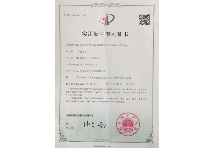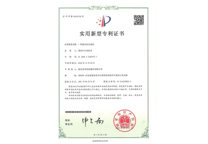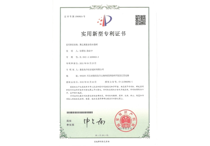 聚乙烯復合防水卷材專利證書